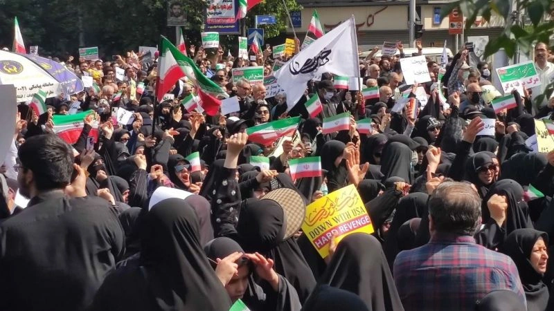İran'ın başkenti Tahran'da meydanda toplanan halk "Amerika'ya ölüm" sloganları atıyor.